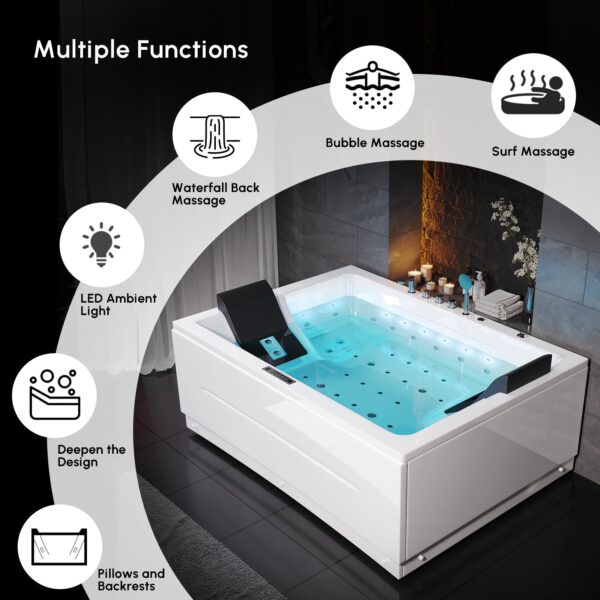 - LED Chromatherapy Jetted Bathtub: Including 20 Chromatherapy lens offers unique, multi-color LED lighting, creating a soothing and atmospheric ambiance for a truly immersive bathing experience.