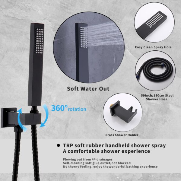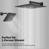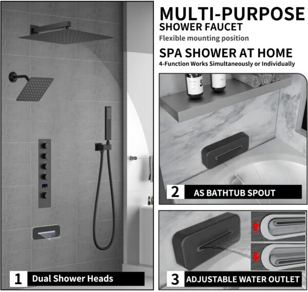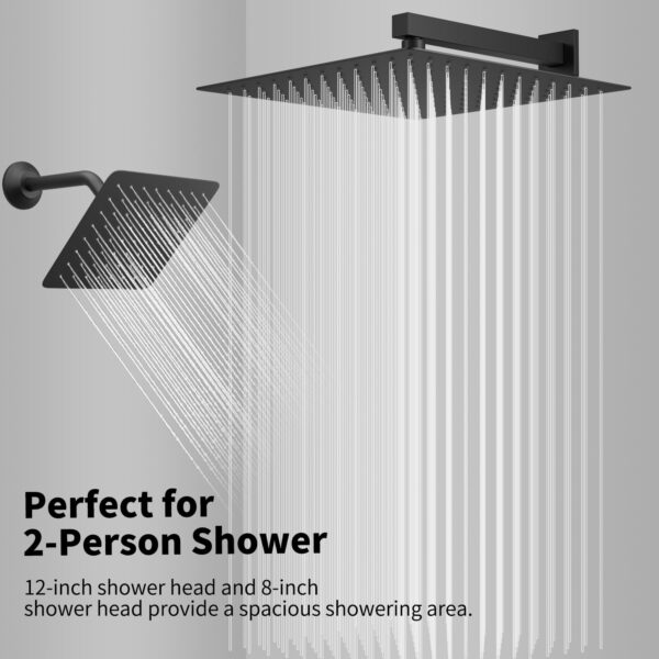 - Dual Top Rainfall Shower Head Design System: The 12 & 8 inches rain shower thanks to the ultra-thin design , even in a low water pressure environment, when the water flows out after being squeezed through the ultra-small space, it can also achieve a high water pressure rain shower experience.Two top shower heads provide you with two different shower experiences, allowing you to relax and enjoy your shower to the fullest.