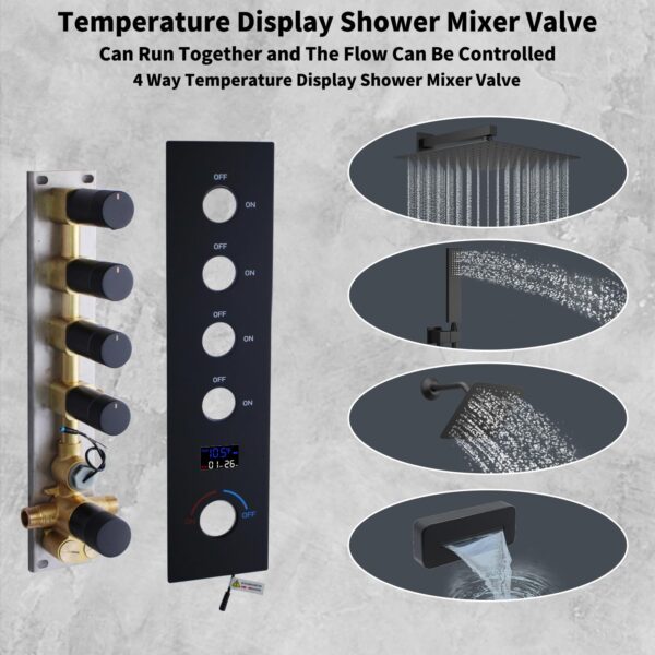 - Four -Function LCD Temperature Digital Display Valve :Fahrenheit temperature display,Pressure Balance Control. LCD digital display function displays the current shower time and water temperature in real time,which can help you to find the most comfortable water temperature without worrying about scald or frostbite by water and tell you how long you have been taking a shower. Built-in hydroelectric generator Hydropower, does not require batteries.