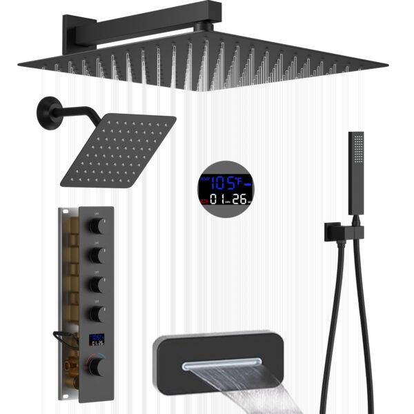 WHSHOWER Thermostatic Matte Black Waterfall Tub Spout Shower System Ceiling Full Body Shower Set with 12″ & 8″ Dual Shower Heads Shower System with Digital Display Valve and Handheld shower