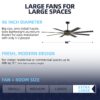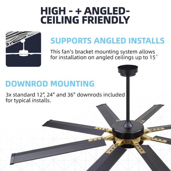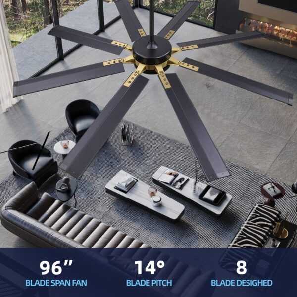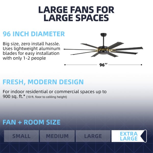 - MODERN INDUSTRIAL STYLE: With a span of 96 inches, this big ceiling fan offers superior ventilation. Eight expansive aluminum blades with decorative winglets stretch out from the center. Perfect for garage, commercial, residential, any home improvement project that wants a sleek, modern look.