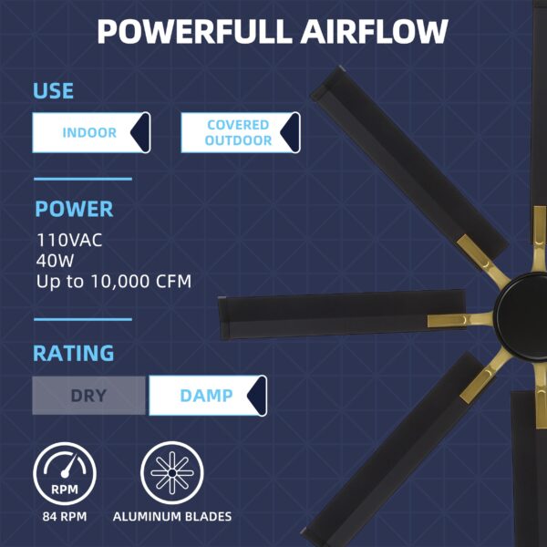 - POWERFUL AIR CIRCULATOR: 120V/60Hz, 40W at High setting, 6 speeds, Reversible, 84 RPM at max speed. This industrial-grade commercial and residential ceiling fan generates a high volume of airflow, up to 10,000 Cubic Feet per Minute (CFM), providing optimal cooling and ventilation throughout large spaces. Ideal for industrial spaces to cool a shop, warehouse, storage facility, or even an enclosed barn.