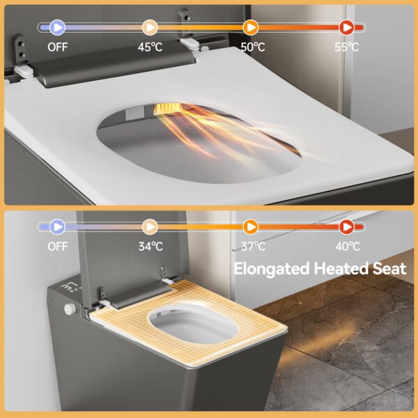 - 【ADJUSTABLE TEMPERATURES】: Experience ultimate comfort with instant warm water and a heated bidet seat, customizable with 4 adjustable water temperatures. Adjust the temperature of the seat, dryer and water to your preference with four settings: normal, 34°C, 37°C and 40°C. Enjoy luxurious comfort no matter the season.