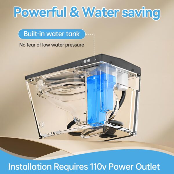 - 【SMART TOILET WITH BUILT-IN TANK】: The rectangular smart toilet features a built-in water tank and powerful pump included for powerful flush performance, ideal for homes with low water pressure. With dual-flush technology (siphon + jet), this smart toilet delivers a powerful clean while using less than 1.28 gallons per flush—combining efficiency with exceptional performance