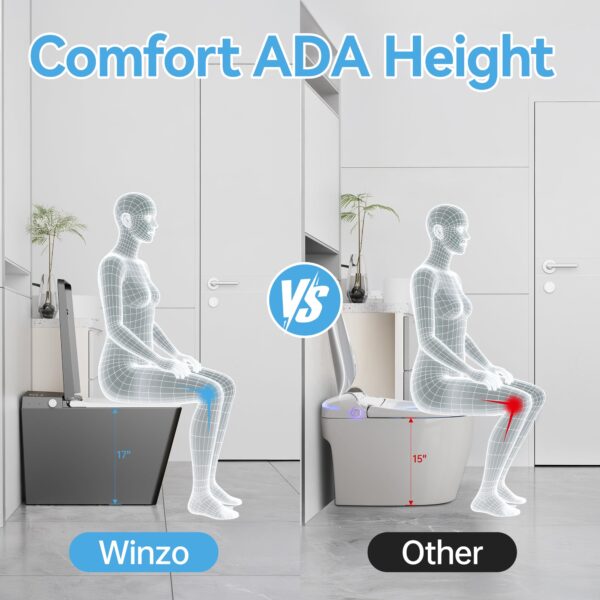 - 【ADA CHAIR HEIGHT DESIGN】: Featuring a 17-3/8’’ floor-to-bowl height, this japanese smart toilet’s ergonomic design complies with ADA requirements while providing ease of use for individuals with limited mobility or knee discomfort, promoting comfort and health.