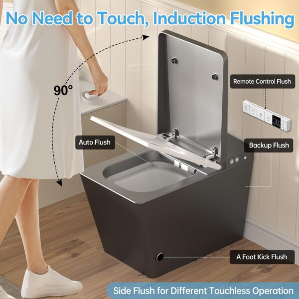 - 【AUTOMATIC FLUSH & FOOT KICK】: The modern smart toilet is with foot-Kick, auto, or remote flushing for ultimate convenience and water efficiency—perfect for modern, eco-conscious bathrooms.