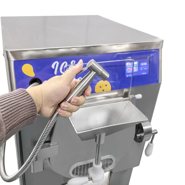 - 5 IN 1 Ice Cream Machine – This commercial hard ice cream machine can produce hard ice cream, Gelato, sorbet, Italian ice or slush by setting different time. Designed with water sprayer, it is convenient for you to clean the machine.
