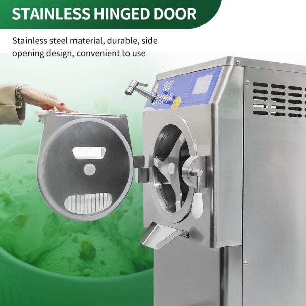 - Stainless Steel Hinged Door – Easy to open and close. Special design blade is compatible for the cylinder, making the ice cream mix evenly.