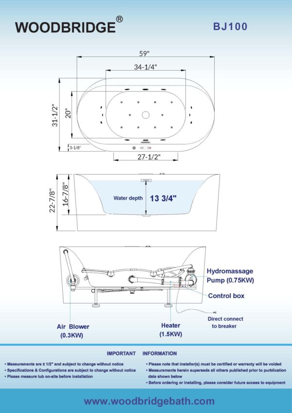Details: WOODBRIDGE 59″ x 31-1/2″ Whirlpool Water Jetted and Air Bubble Freestanding Heated Soaking Combination Bathtub with LED control panel,BJ-100