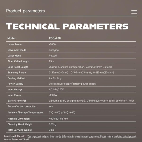- INTRODCUTION – WTTTOOLS 200 W backpack laser cleaning machine, with upgraded back straps and belts, small volume, and lightweight design, provides you a precision cleaning without damaging your substrates. Power Supply: AC 110V/220V/Lithium battery supply. Laser Type: Pulsed. Fiber Cable Length: 1.5m. Output Power: >200W. Cooling Method: Air Cooling. Power Consumption: <1000W. Scanning Range: 160mm. Machine Dimension: 22.9*15.7*6.1in. Cleaning Head Weight: 0.62kg/1.37lbs. Total Weight: 21kg/46.3lbs