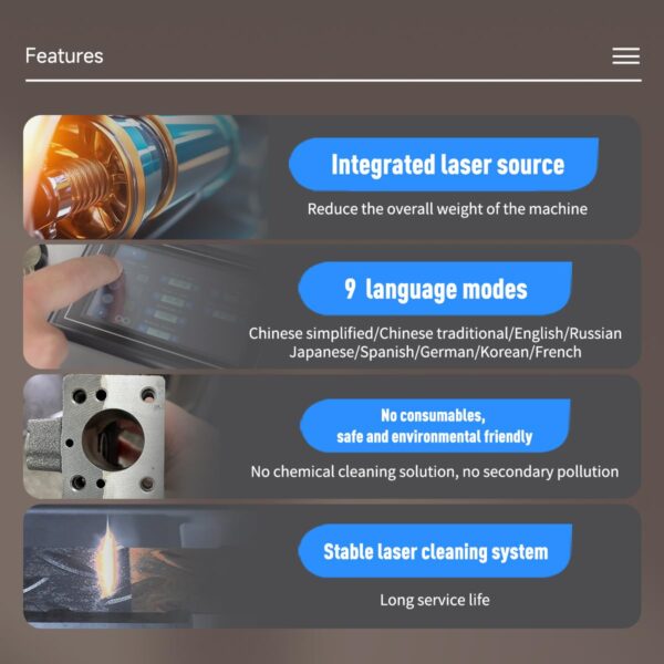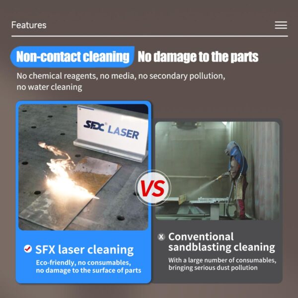 - WIDE APPLICATION – This pulsed backpack laser cleaner is widely used in various industries such as aerospace, automobile, tire hub, pharmaceutical, chemical, etc. Suitable for rust removal, oil removal, paint removal, coating removal, plating removal, adhesive layer removal, cultural relic restoration, etc. Non-cleaning design and integrated laser source help clean without damaging your workpiece. Green technology and eco-friendly, it will not creat second polltution while cleaning.