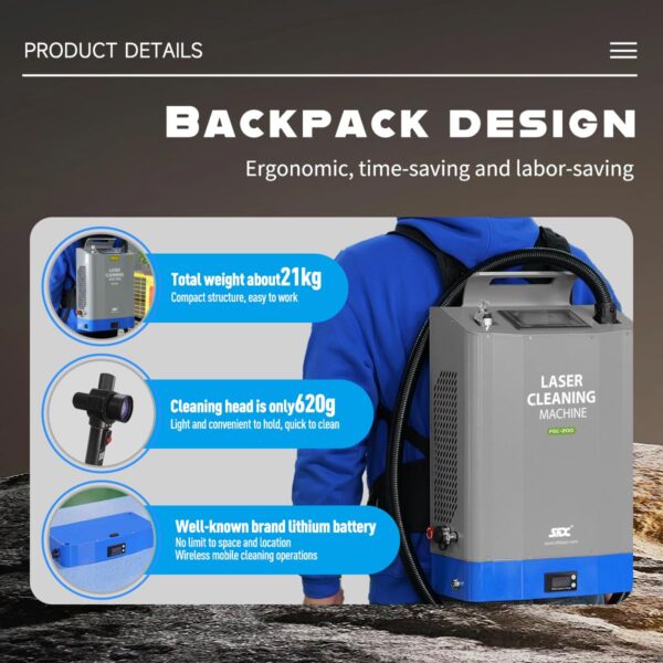 - UPGRADED BACKPACK DESIGN – Different from our first generation of backpack laser rust removal, this model of laser cleaner with upgraded straps, back cushion support, and widened belts at waist, provides you with a comfortable cleaning without burning long-time backing fatigue. Besides, the portable and handheld design helps you clean without space and time limitations. Additionally, blowing equipment at the cleaning gun is added to reduce the damage to the inner lens.