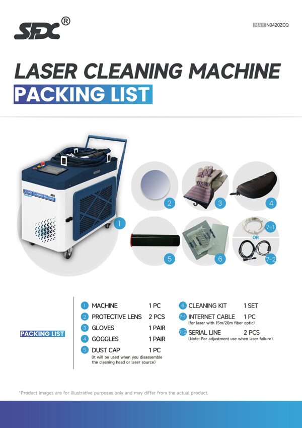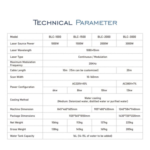 - PARAMETERS: Laser Brand: MAX; Laser Source Power(W): 2000; Laser Wavelength: 1080±10nm; Scanning Width: 160±10mm; Laser Type: Continuous/Modulation; Maximum Modulation Frequency: 20KHz; Output Power(KW): 10; Cleaning Efficiency: 15-45㎡/h; Cable Length: 32ft for (Customized to 49ft); Voltage: 220V 1-Phase; Cooling Method: Water Cooling (Medium: Deionized Water, Distilled Water or Purified Water); Package Dimensions: 44*22.2*41.3in; Water Tank Capacity: 16L (14-15L of Water to be Added).