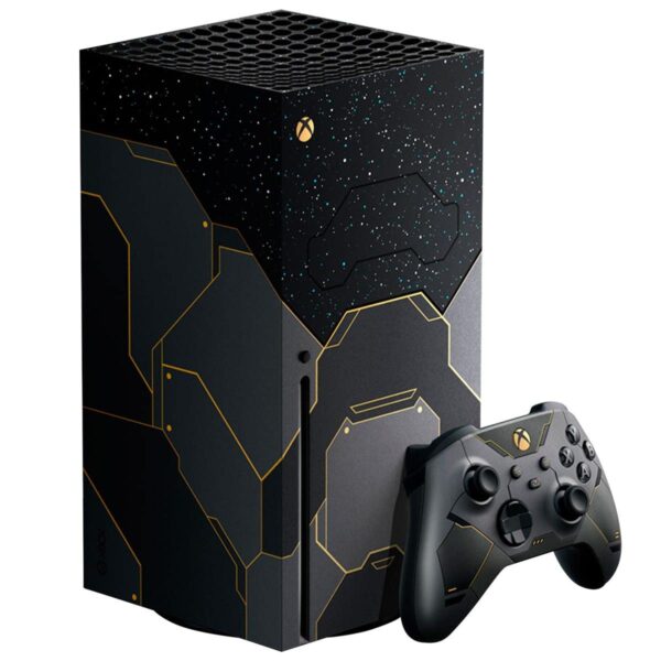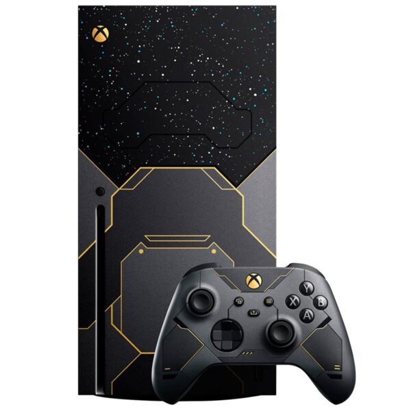 - Includes a custom console design imprinted with stars as seen from the surface of Zeta Halo—extending onto the fan behind a Cortana blue vent. Inspired by the Master Chief’s armor, dark metallic paneling is accented by iridium gold on the console and its matching controller with side and back grips to accommodate all play styles.