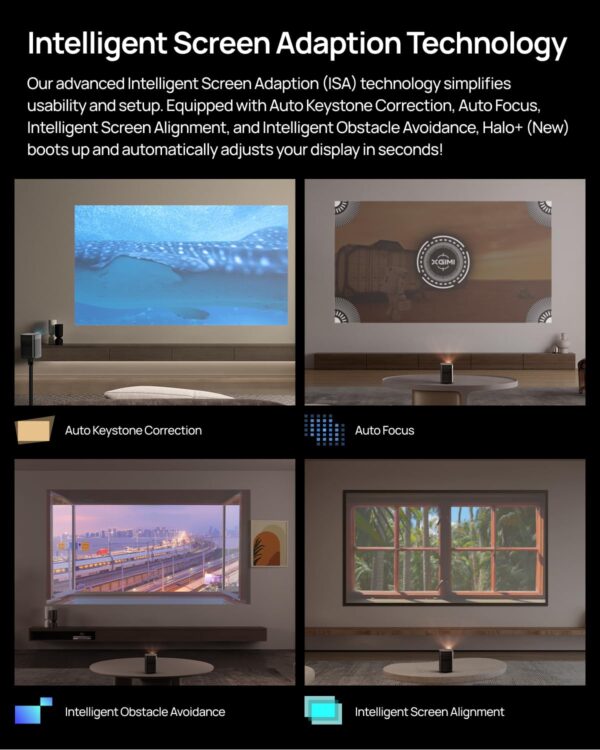 - Intelligent Screen Adaption: Our advanced Intelligent Screen Adaption (ISA) technology simplifies usability and setup. Equipped with Auto Keystone Correction, Auto Focus, Intelligent Screen Alignment, and Intelligent Obstacle Avoidance, Halo+ boots up and automatically adjusts your display in seconds!