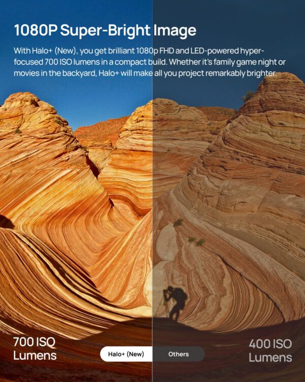 - 1080P Super-Bright Image: With Halo+, you get brilliant 1080p FHD and LED-powered hyper-focused 700 ISO lumens in a compact build. Whether it’s family game night or movies in the backyard, Halo+ will undoubtedly make all you project remarkably brighter.