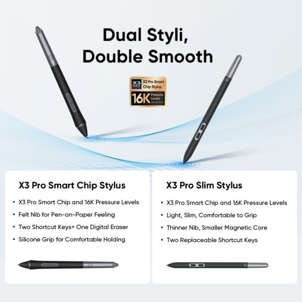 - Dual X3 Pro Chip Styluses: Both styluses have 16,384 pressure levels and a 60° tilt function. The Slim Stylus features a lightweight, slim design with a thinner nib, smaller magnetic core, and replaceable keys, while the Smart Chip Stylus offers a pen-on-paper feel with a felt nib, two shortcut keys and a digital eraser for productivity. The pen case holds both styluses, acts as a stand, and includes 28 extra nibs and 2 detachable pen clips for easy replacement