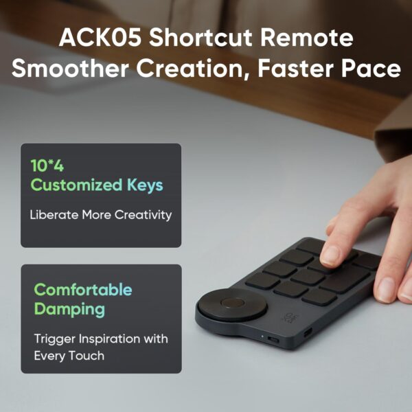 - ACK05 Wireless Keydial: Features 10*4 customizable keys and physical dial allow for smoother workflows and faster access to frequently used functions, making it a valuable tool for streamlining the creative process. The ergonomic, one-handed design offers effortless control, reducing strain and fatigue during long work sessions