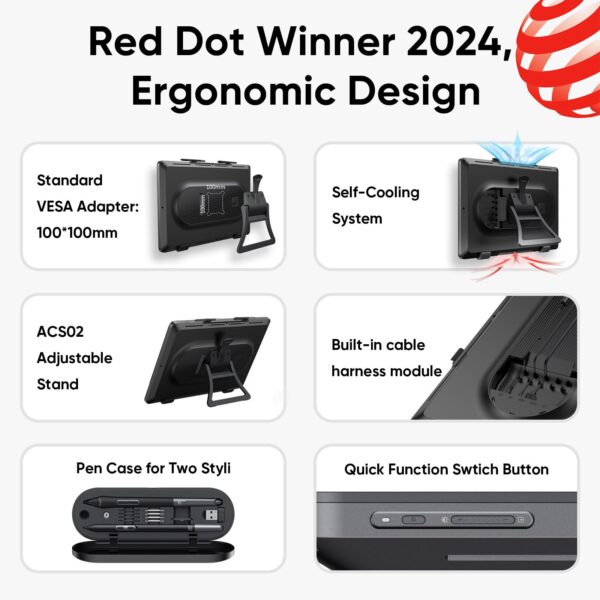 - Upgraded Accessories: The ACS02 Stand offers single-handed angle adjustment from 16° to 72° for various drawing positions. It has vesa hole (100*100mm)on the back for optional ACS15 Stand(not included) adds height adjustment, under-desk creation, and rotation. Connect the display via USB-C, Display Port, or HDMI for easy switching between devices like MacBooks and Windows laptops. A built-in cable harness enhances stability, while multi-functional buttons allow quick brightness and signal adjustments