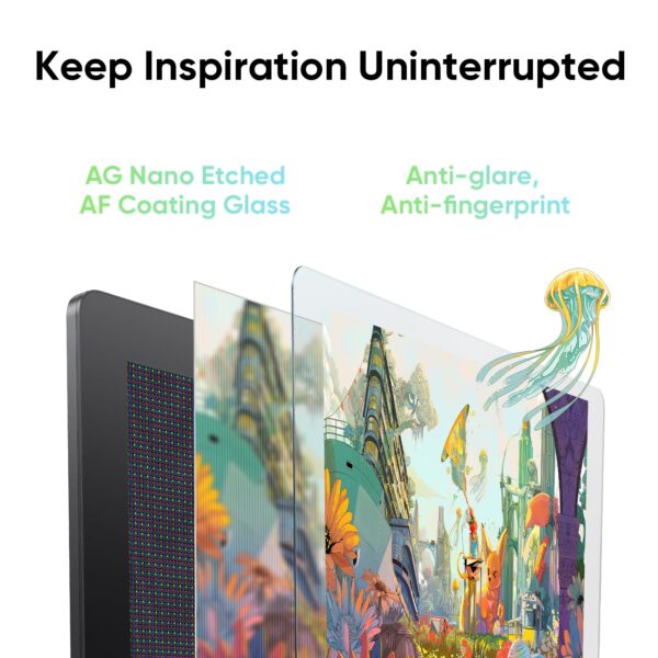 - AG & AF Glass: The AG etched glass minimizes glare, helping artists and designers maintain focus during long sessions. The anti-fingerprint coating keeps the surface clean for better usability. Nanoscale etching prevents pixel flash points for a smooth visual experience, while full lamination reduces parallax, making drawing feel more intuitive and paper-like